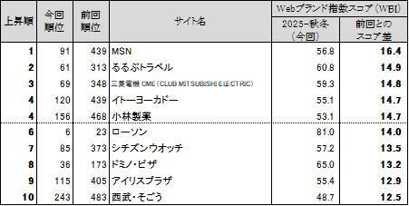 「MSN」は前回から16.4ポイント増の56.8ポイント、「るるぶトラベル」は14.9ポイント増の60.8ポイント、「三菱電機 CME」は14.8ポイント増の59.3ポイント。順位は「MSN」が前回第439位から第91位、「るるぶトラベル」は前回第313位から第61位、「三菱電機 CME」は前回第348位から第69位となった。