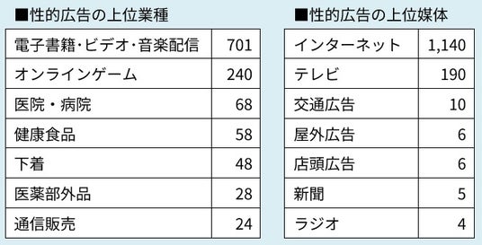 性的な広告については、多くがインターネット(1,140件)であり、テレビは190件、交通広告10件、屋外広告6件、新聞広告5件などがあった。インターネットはと交通広告は電子コミックとオンラインゲームの広告、テレビはVODの番組CM、屋外広告はビル壁面の3D広告に水着姿の女性が映し出されたオンラインゲームの広告、新聞広告は健康食品の広告に対するものだった。