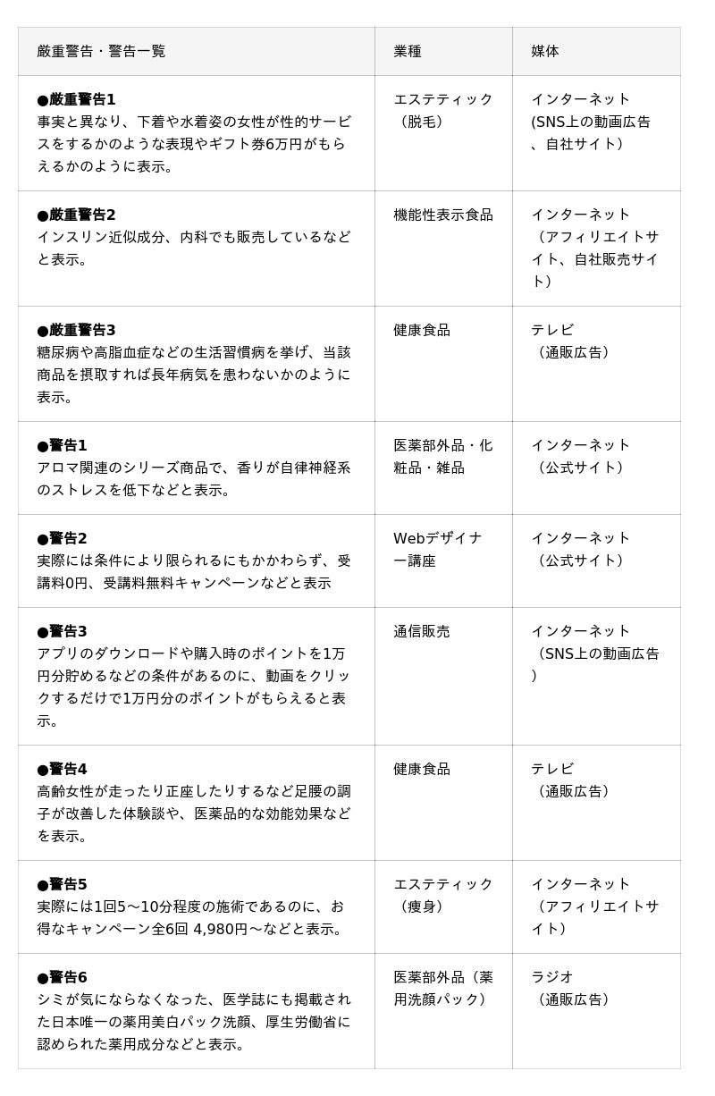 表示の上位は医薬部外品、医院・病院、通信販売だった。医薬部外品はシミが簡単に取れるようにうたうものや定期購入ではないと表示するが定期購入契約させるものなど、医院・病院は脂肪が消滅などとうたうものや安い料金をうたって実際は高額となるというもの、通信販売では無料でもらえるとうたうが後から条件が分かりもらえないというもの、など。