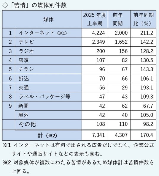 報道等の影響により苦情が増えたことで、多くの媒体の件数が増加した。インターネットは前年同期比211.2%、テレビ142.2%にも上った。媒体のインターネットで多かった業種は、1.電子書籍・ビデオ・音楽配信636件、2.医薬部外品576件、3.オンラインゲーム403件、4.医院・病院224件、5.通信販売178件だった。いずれも前年同期より増加しており、前年同期比209.4%(通信販売)から467.6%(電子書籍)と倍以上に増加した。このほか著名人の動画を生成AIで作成した詐欺広告など証券・債権・投資その他が457.1%(21件→96件)となった。