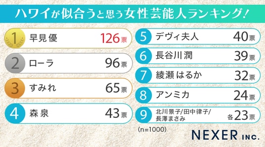 「ハワイが似合う女性芸能人」のアンケートでは、ハワイ出身でバイリンガルの経歴を持つ「早見優」さんが圧倒的な支持で1位でした。