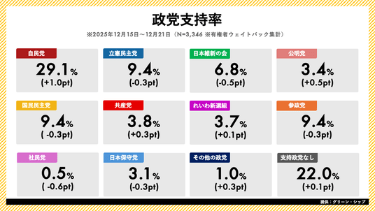 ジャッグジャパン株式会社(本社:東京都渋谷区)は、株式会社グリーン・シップ(本社:東京都千代田区)と業務提携し、グリーン・シップが提供する日次世論調査「世論レーダー」のデータを提供しております。本日、2025年12月第3週(12月15日~21日)の内閣支持率・政党支持率調査の結果を発表いたします。また、詳細レポートPDFを「世論レーダー」公式サイトの週次ページで1,980円(税込)で販売開始しました。