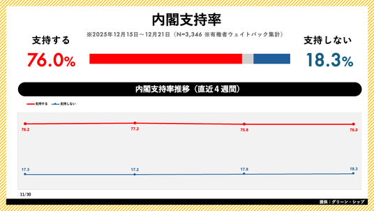 高市内閣の支持率は76.0%(前週比+0.2pt)となりました。