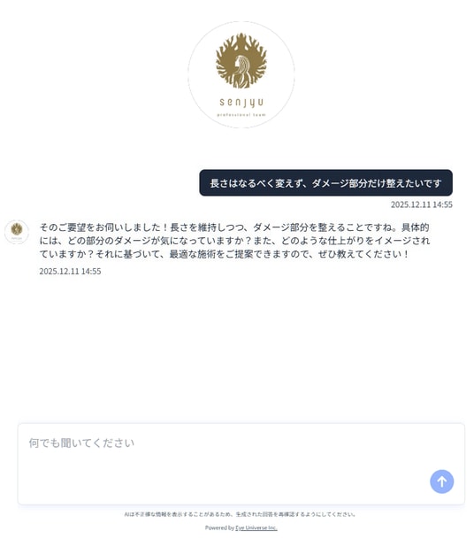 SENJYUには、他店での失敗や長年のダメージに悩む方が多く来店されます。最初に抱えるのは、「本当にきれいになるのか」「また失敗しないか」という不安です。人力チャットだけでは、営業時間やスタッフ状況に左右される課題がありましたが、美容師AIクローンの導入により、お客様の不安を“いつでも”受け止められる環境が整いました。今後も、オンラインとオフラインの両面から、髪の悩みに寄り添うサロンであり続けたいと考えています。