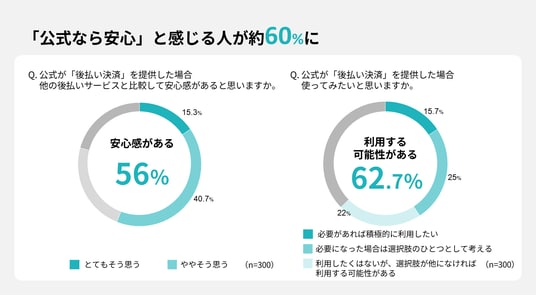 公式が提供する金融サービスの利用意向について聞いたところ、「公式が後払いサービスを提供する場合」56%が「一般的なサービスより安心感がある」と評価。さらに、3人に1人以上が利用することに好意的な反応を示しました。