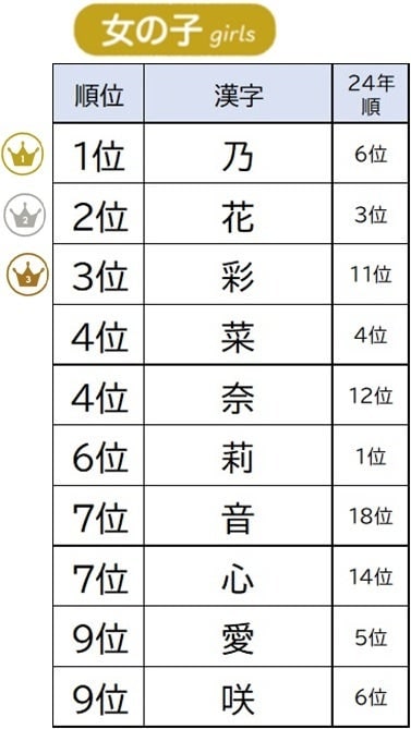 女の子の漢字では、昨年7位だった「乃」が1位に。「莉」や「花」「菜」など、花や植物を表す漢字が好まれているようです。