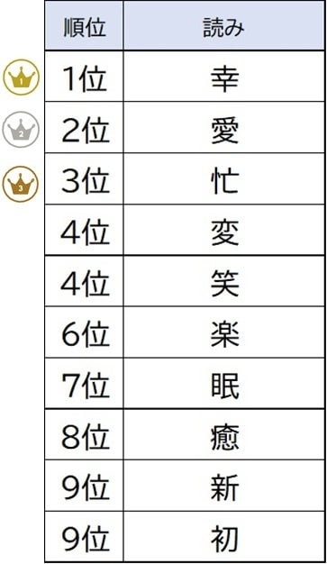 もっとも多く回答された「幸」は2年連続1位に。生まれてきた子どもを見て、成長していく我が子を見て、幸せを感じる方が多かったようです。とにかく可愛い、愛おしいというコメントが多く、家族の愛情を感じます。