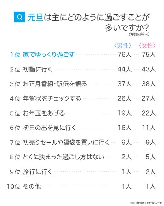 成人男女200人に「元旦は主にどのように過ごすことが多いか(複数回答可)」と尋ねたところ