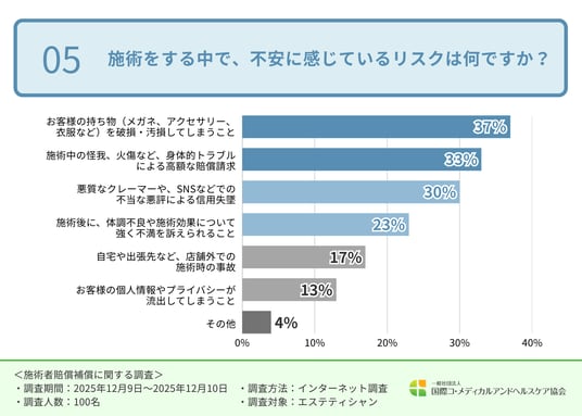 次に、施術をする中で、不安に感じているリスクを伺ったところ、「お客様の持ち物(メガネ、アクセサリー、衣服など)を破損・汚損してしまうこと(37.0%)」と回答した方が最も多く、「施術中の怪我、火傷など、身体的トラブルによる高額な賠償請求(33.0%)」「悪質なクレーマーや、SNSなどでの不当な悪評による信用失墜(30.0%)」という回答が続きました。