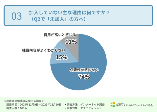 未加入の理由として最も多かったのは「必要性を感じない」でしたが、これはリスクが顕在化していないだけであり、実際には多くの施術者が賠償請求や信用低下への不安を抱えていることがその後の調査でわかります。