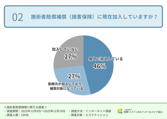 次に、施術者賠償補償または損害保険に現在加入しているかどうか伺ったところ、「個人で加入している(46.0%)」と回答した方が最も多く、「勤務先が加入しており補償対象(27.0%)」「加入していない(27.0%)」と続く結果となりました。