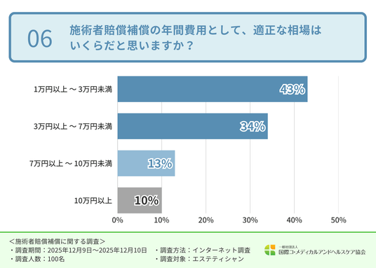 金銭の損失につながるトラブルを経験している方も多い中、施術者賠償補償サービスの年間費用として、適正な相場はいくらだと思うか伺ったところ、「1~3万円未満(43.0%)」と回答した方が最も多く、「3~7万円未満(34.0%)」が続きました。