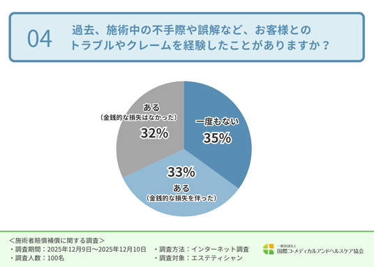過去、施術中の不手際や誤解など、お客様とのトラブルやクレームを経験したことがあるか伺ったところ、「ある(金銭的な損失を伴った)(33.0%)」「ある(金銭的な損失はなかった)(32.0%)」「一度もない(35.0%)」という結果が集まり、約65%が何らかのトラブルを経験していることが分かりました。