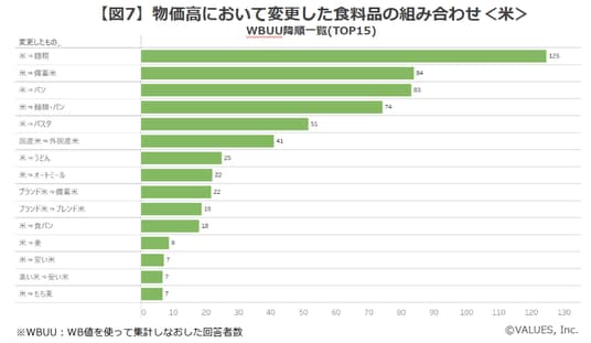 また、食料品の代替される組み合わせは、582名が回答した「バター→マーガリン」が最も多い結果となりました。代替行動の傾向は、大きく分けて「1.品種の変更」「2.外国産への切り替え」「3.他商品での代用」の3パターンが見られます。特にお米に関しては、天候不順等の環境要因による価格高騰も重なり、代替商品の需要が増加したと考えられます。