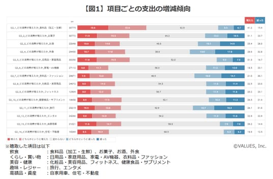 ◆食料品の支出増が約4割で最多!「外食」は増減が二極化する傾向に