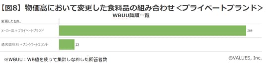 近年、プライベートブランドは商品数の拡充など広く展開され、需要の高まりが見受けられます。本調査の結果からは、計292名の回答者がメーカー品からプライベートブランドへと代替していることが明らかになりました。その内訳は、一般的なメーカー品からの切り替えが269名、調味料からの切り替えが23名となっています。ヴァリューズの別調査(プライベートブランドとナショナルブランドの購買実態調査)によれば、「魚練りもの(19.5%)」「粉類(19.2%)」「大豆加工品・コンニャク類(18.9%)」のプライベートブランド購入比率が高く、今回の調査で見られた消費行動の変化も、こうしたカテゴリが牽引していると推測されます。