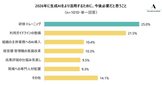 全国の20~59歳の就業者1,010人に対し、「2026年に生成AIをより活用するために、今後必要だと思うことは何ですか」と質問したところ、もっとも多かった回答は「研修・トレーニング」(25.0%)でした。現在、多くの企業がリスキリング・アップスキリングに取り組んでいますが、生成AIが日々進化するなか、その取り組みをより強化することが、就業者からも求められていることが伺えます。