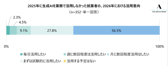- 2025年は生成AIを全く活用していなかった就業者の半数近くが、2026年は活用への意欲を示す