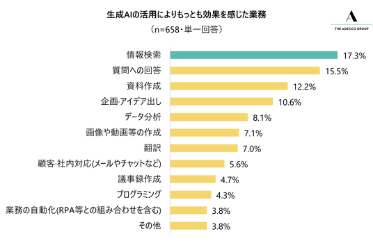 生成AIを業務で活用していると回答した全国の20~59歳の就業者658人に対し、「もっとも効果を感じた業務は何ですか」と質問したところ、もっとも多く挙げられたのは「情報検索」(17.3%)でした。