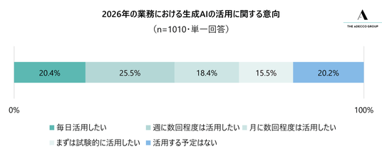 全国の20~59歳の就業者1,010人に対し、「2026年に生成AIをどの程度活用する予定ですか」と質問したところ、約8割となる79.8%が、「活用したい」と回答しました(「毎日活用したい」20.4%、「週に数回程度は活用したい」25.5%、「月に数回程度は活用したい」18.4%、「まずは試験的に活用したい」15.5%)。