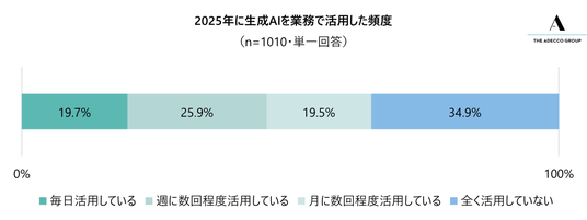 全国の20~59歳の就業者1,010人に対し、「今年、生成AIを業務でどの程度活用していますか」と質問したところ、「活用している」と回答したのは全体の約7割となる65.1%(658人)でした(「毎日活用している」19.7%、「週に数回程度活用している」25.9%、「月に数回程度活用している」19.5%)。「全く活用していない」と回答したのは、34.9%(352人)でした。