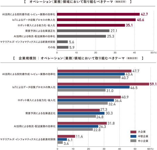 企業規模別にみると、大企業では「IoTによるデータ収集プロセスの無人化」(59.1%)が突出して高く、現場データの自動取得や可視化を通じて業務効率や判断精度の向上を図る動きがみられます。全体として、オペレーション領域では、AI・IoT・ロボティクスを中心に、効率化・自動化への取り組みが重点テーマになっております。