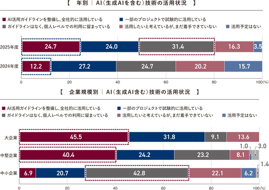 全体では、「ガイドラインはなく、個人レベルでの利用に留まっている」(31.4%)が最も多く、「活用したいと考えているが、まだ着手できていない」(16.3%)も一定数存在しますが、「活用予定はない」は3.5%にとどまりました。年次比較では、「全社的に活用」が2024年12.2%から2025年24.7%へ上昇しており、全社レベルでの活用が広がりつつあります。
