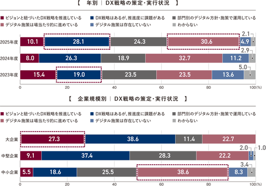 全体では、「デジタル施策は場当たり的に進めている」(30.6%)が最も多く、「DX戦略はあるが推進度に課題がある」(28.1%)が続きました。「DX戦略はあるが推進度に課題がある」の回答率は2023年19.0%から2025年28.1%へ上昇しており、実行段階の企業が増加していることが分かります。一方で、「ビジョンと紐づいたDX戦略を推進している」は約1割にとどまりました。