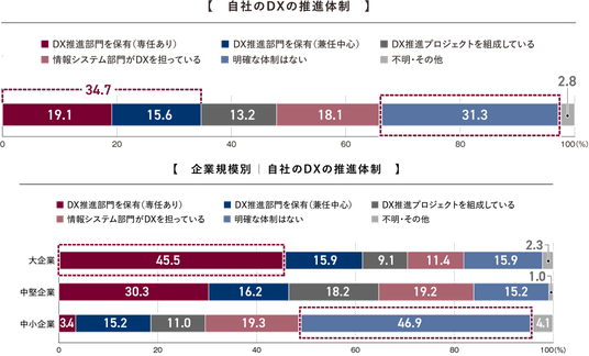 「明確な体制はない」(31.3%)が最多となった一方で、「DX推進部門を保有(専任あり・兼任中心)」は合計で34.7%となり、一定数の企業では体制整備が進んでいることが分かりました。