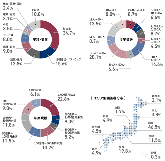 ※本調査では、アンケートにご回答いただいた企業において、従業員規模が2000人超を大企業、300人超~2000人以下の企業を中堅企業、300人以下の企業を中小企業として分類し、分析を行いました。※各図表の構成比(%)は小数点以下第2位を四捨五入しているため、合計しても100%にならない場合があります。