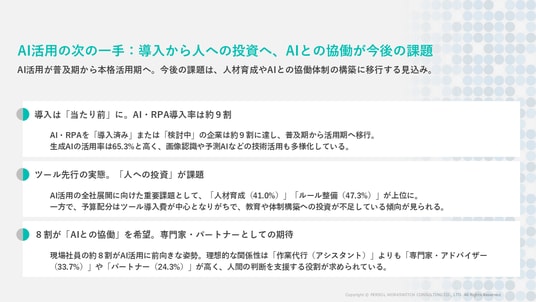 本調査の結果、AI・RPAの導入率は約9割に達し、企業の標準的な取り組みとして定着している一方で、ツール導入に偏重し、それを使いこなすための「人材育成」や「ガイドライン整備」といった組織・人への投資が追いついていない実態が浮き彫りになりました。