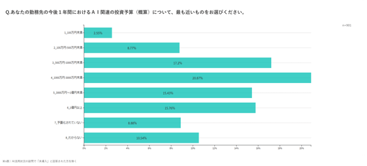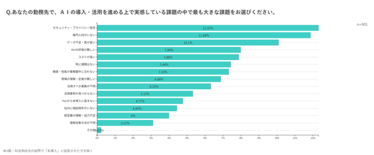 AI関連の年間予算として「1,000万円以上」を投じる企業も一定数存在する一方、その使途はライセンス費やシステム導入費が中心となる傾向があります。全社的な活用推進に進むためのとして、「セキュリティ・プライバシー懸念(12.3%)」や「専門人材がいない(11.9%)」が上位に挙がっており、ハード(ツール)だけでなくソフト(人・組織)への投資バランスの見直しが急務となっています。