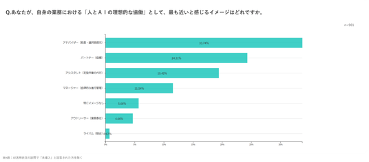 現場社員に対し「人とAIの理想的な協働イメージ」を尋ねたところ、「専門家・アドバイザーとして助言をもらう(33.7%)」や「同僚・パートナーとして協力する(24.3%)」が上位を占め、AIは人間の能力を拡張し、共にはたらく存在として捉える意識が高まっています。