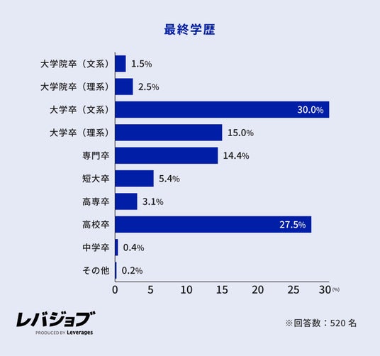 レバレジーズ株式会社が運営するエッセンシャルワーカー向けキャリア支援サービス「レバジョブ」は、現在ブルーカラー職*1に就く労働者のうち、前職がホワイトカラー職種に従事していた方520名を対象に転職実態調査を実施しました。