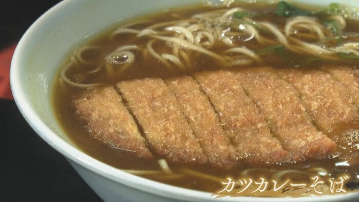 多くの人のお目当ては『みすゞ庵』の名物、カツカレーそば。出汁の効いたカレーそばの上に、揚げたての大きなカツを載せた一品は、常連客のリクエストから生まれたという。