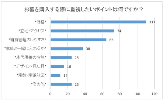 ・お墓の購入する際に重視するポイントについては、1位「価格」、2位「立地・アクセス」、3位「維持管理のしやすさ」と40代以上の回答と一致する結果となった。