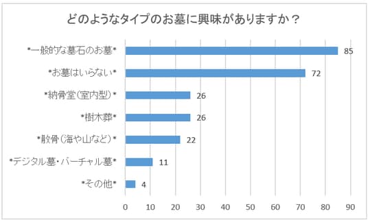 ◇どのようなタイプのお墓に興味がありますか?という質問に対しては、一般的な墓石のお墓(42.5%)がトップで、樹木葬(13.0%)、散骨(11%)。