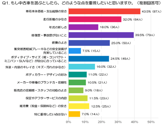 Q1. もし中古車を選ぶとしたら、どのような点を重視したいと思いますか。(複数回答可:注1)