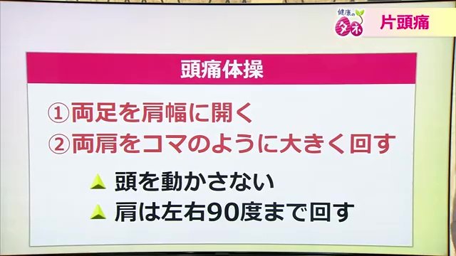 この体操を行うことで、頭痛を改善するストレッチ信号が脳に送られ、痛みを鎮めることができる。発作が起こっている時は避け、1日2分を目安に行うことを推奨している。
