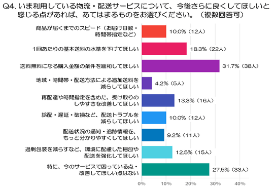 - 一方で、「特に、今のサービスで困っている点・改善してほしい点はない」と回答した人も27.5%(33人)と一定数存在しています。現状の物流・配送サービスに大きな不満を抱いていない層がいることも、この結果から読み取れます。