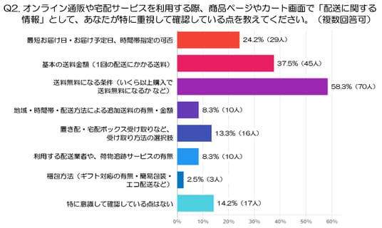 Q2. オンライン通販や宅配サービスを利用する際、商品ページやカート画面で「配送に関する情報」として、あなたが特に重視している点を教えてください。 ※Q1で「オンライン系チャネルを1つ以上選んだ人」が対象(複数回答可:注1)