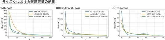 そして、これらの結果から、相対的に高い次元数(6次元)を有するtc-Lorenzタスクは、リザバーの有効記憶時間域において高い複雑性を持つことが明らかとなりました。このため、全リザバーサイズが固定されている制約下では、入力次元の分割によって各サブリザバーのサイズが相対的に小さくなり、その限られた表現力では高い複雑性を持つ信号を処理しきれなかったことが、性能低下の主要因であると結論付けられました。この分析により、「次元分割による構造的利点」と「個別のリザバーそれぞれの表現力」がトレードオフの関係にあり、このHetAESNの信号処理能力を決定づけることが明らかとなりました。