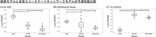 3種類のカオス時系列システムtwo-coupled Van der pol (tc-VdP)[5]、Hindmarsh-Rose (HR)[6]、two-coupled Lorenz (tc-Lorenz)[7]に対して予測性能を検証しました。その結果tc-VdP、HRタスクにおいて、HetAESNは、従来のESN、AESNと比較して、有意に小さいLog-NRMSE(予測誤差の評価指標)[9]を達成し、従来モデルよりも高い予測性能を示しました。特にHRモデルでは、