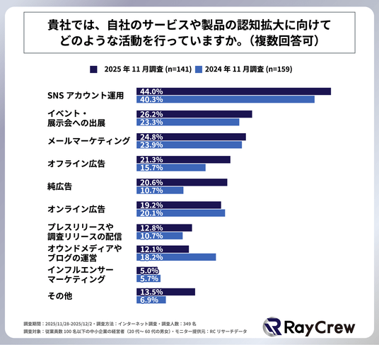 調査PR|調査リリースの代行サービスを提供する、株式会社レイクルー(本社:東京都新宿区、代表取締役社長:藤本 太樹)は、従業員数100名以下の企業の経営者を対象に「自社サービス・製品の認知拡大に向けた活動の実態に関する調査」を2024年の11月に続き、今年も実施しました。この調査結果から、従業員100名以下の中小企業の認知拡大活動の実態や課題などが明らかになりました。