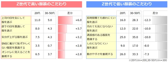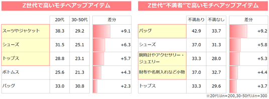 最後に、世代間、さらにZ世代内の「服装に対する不満の有無」によって、どのファッションアイテムがモチベーションに影響を与えるかを比較しました。<data3>