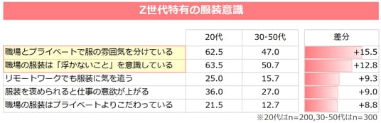 Z世代では、30~50代と比べて「職場とプライベートで服の雰囲気を分ける(+15.5pt)」、「浮かないことを意識する(+12.8pt)」といった傾向が顕著であり、TPOを強く意識している様子がうかがえます。また「服装を褒められると仕事の意欲が上がる(+9.0pt)」、「職場の服装はプライベートよりもこだわる(+8.8pt)」といった意識も高く、評価や自己表現の手段として職場の服装を捉えていることがわかります。
