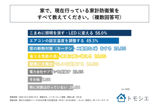 次に、「現在、ご自宅で行っている家計防衛策は何か」を尋ねる設問への回答では、1位が「こまめに照明を消す・LEDに変える」で56.0%、2位が「エアコンの設定温度を調整する」で49.3%、3位が「窓の断熱対策(カーテン・二重窓など)をする」で24.8%という結果になりました。この結果から、自宅における主な家計防衛策は、「こまめに照明を消すこと・LEDへの変更」や「エアコンの設定温度の調整」であることがわかりました。