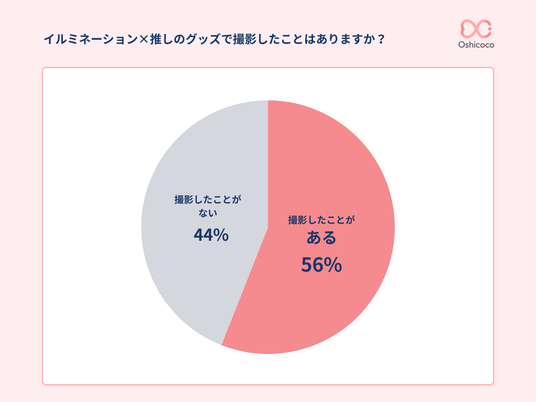 実際にイルミネーションスポットで推しのグッズと撮影をした経験について調査したところ、56%が「ある」と回答しました。半数を超える推し活層が、冬ならではのイルミネーションという非日常的な空間で、推しグッズを主役にした写真を撮影していることが明らかになっています。