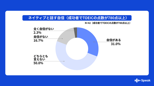 ・英会話学習成功者で、TOEICの点数が780点以上と高得点の方に限定して、同じく英会話力の自信を確認すると、自信がある(非常に自信がある、自信があると回答した合計)と答えたのはわずか31.0%に留まりました。