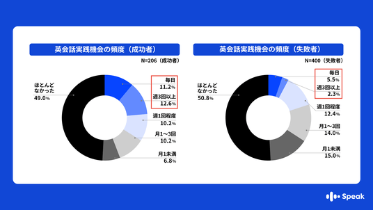 1.【頻度の格差】英会話学習の成功者は、失敗者に比べて「週3回以上英語を話す」割合が約3倍高いことが判明!2.【学習法の違い】成功者の学習法1位は「発話練習」、失敗者は「リスニング・文法」が中心。